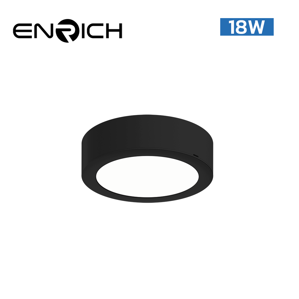โคมไฟดาวน์ไลท์ LED หน้ากลม ENRICH EASY-O สีดำ 18W 8นิ้ว เป็นโคมไฟดาวน์ไลท์ LED ที่มีคุณสมบัติเพียบพร้อมสำหรับการใช้งาน ได้รับการออกแบบให้มีความสว่างสูงสุดถึง 100 Lumen/Watt ถือเป็นระดับความสว่างที่สูง ช่วยประหยัดพลังงานไฟฟ้าอย่างมีประสิทธิภาพ อีกทั้งยังมาพร้อมกับค่าแสงขาว Daylight 6500K ที่ให้แสงสว่างในลักษณะธรรมชาติ เหมาะสำหรับการใช้งานในห้องที่ต้องการความชัดเจนและความสว่างที่เพียงพอ เช่น ห้องทำงาน ห้องนั่งเล่น หรือห้องประชุม สามารถติดตั้งได้ทั้งแบบติดลอยและแบบฝังฝ้า มีความยืดหยุ่นในการเลือกวิธีการติดตั้งตามความต้องการของผู้ใช้งาน ไม่ว่าจะเป็นการติดตั้งบนเพดานหรือซ่อนในฝ้าเพดาน มาพร้อมกับระบบป้องกันไฟกระชากที่สามารถรองรับกระแสไฟฟ้าสูงถึง 500V ป้องกันความเสียหายที่อาจเกิดขึ้นกับโคมไฟเมื่อต้องเผชิญกับไฟกระชากหรือไฟไม่เสถียร